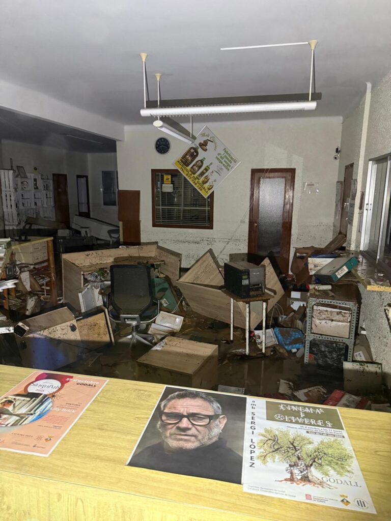 Le lendemain, le paysage était désolant. Alexis Albiol, président de la coopérative d’huile du village et maire de Godall, a indiqué qu’une cinquantaine de maisons avaient été touchées par les inondations, dont quatre présentaient des dommages structurels importants. Parmi les bâtiments les plus endommagés figurent la mairie, les bureaux de la coopérative et les deux bars du village. Les habitants dont les maisons ont subi les dommages les plus importants ont été relogés chez des proches ou dans des résidences secondaires.